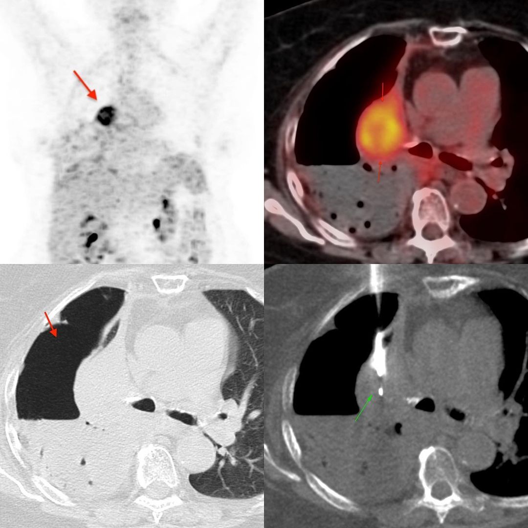 This 81 years old lady presented with a hydropneumothorax. A CT scan showed a possible mass in the atelectatic right upper lobe. A PET/CT confirmed a mass with uptake.
